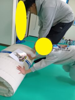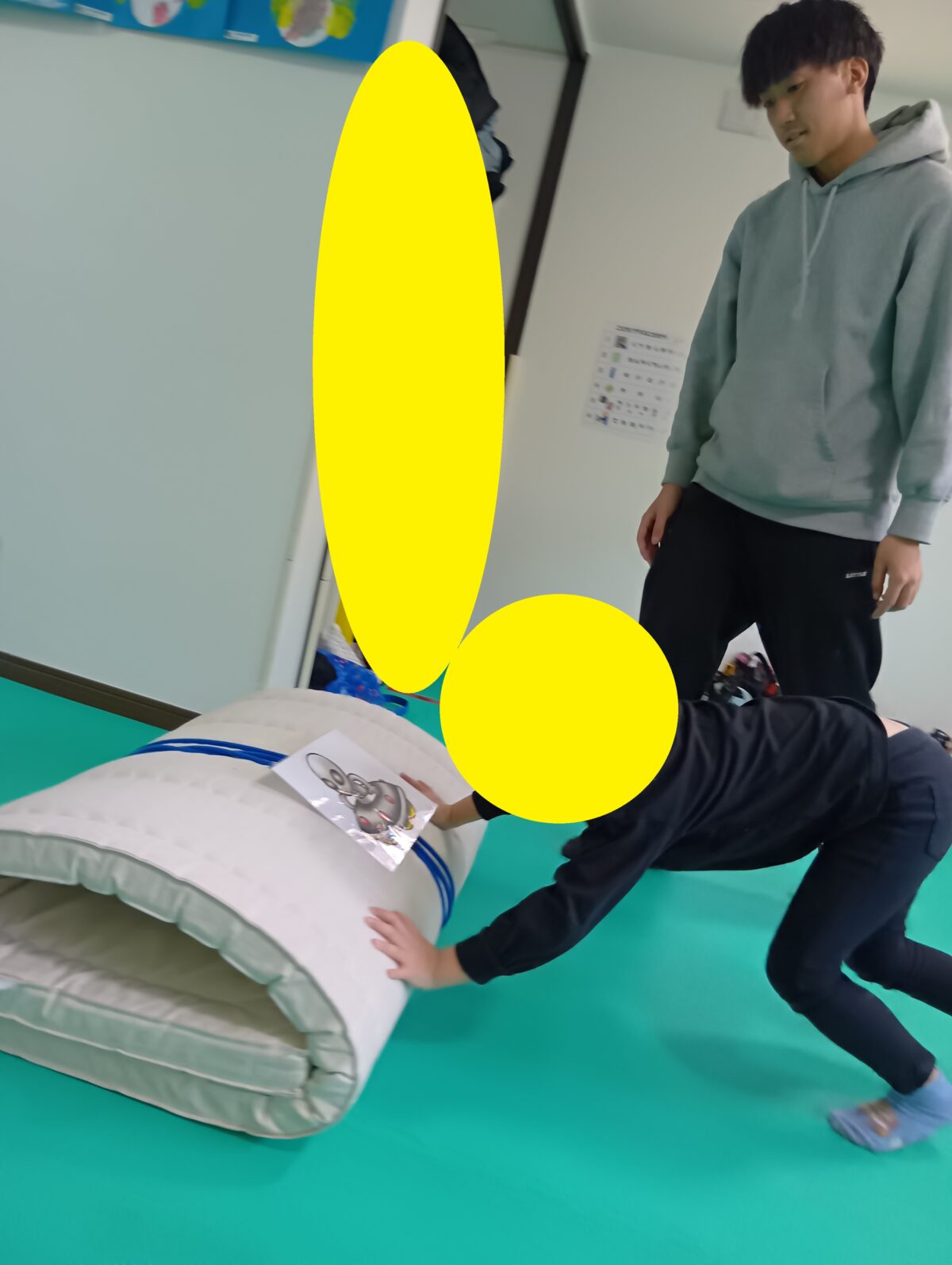 丸めたマットを押し込んで腕の力を鍛え…
